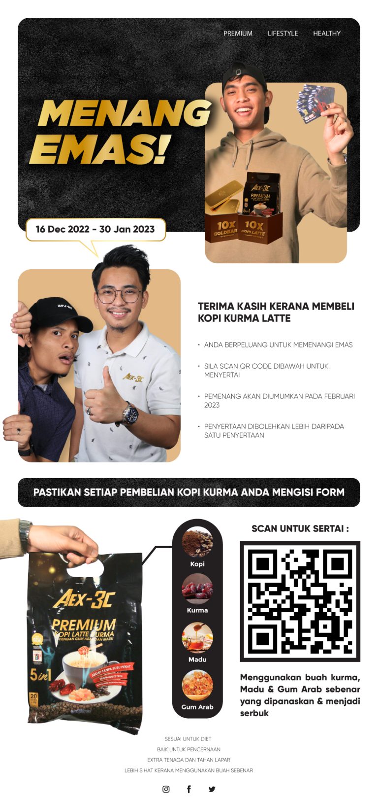 This email design promotes a purchase incentive campaign where customers stand a chance to win gold with every Kurma Latte purchase. The layout emphasizes campaign value, reward visibility, and clear call-to-action, guiding readers smoothly from headline to participation details.
